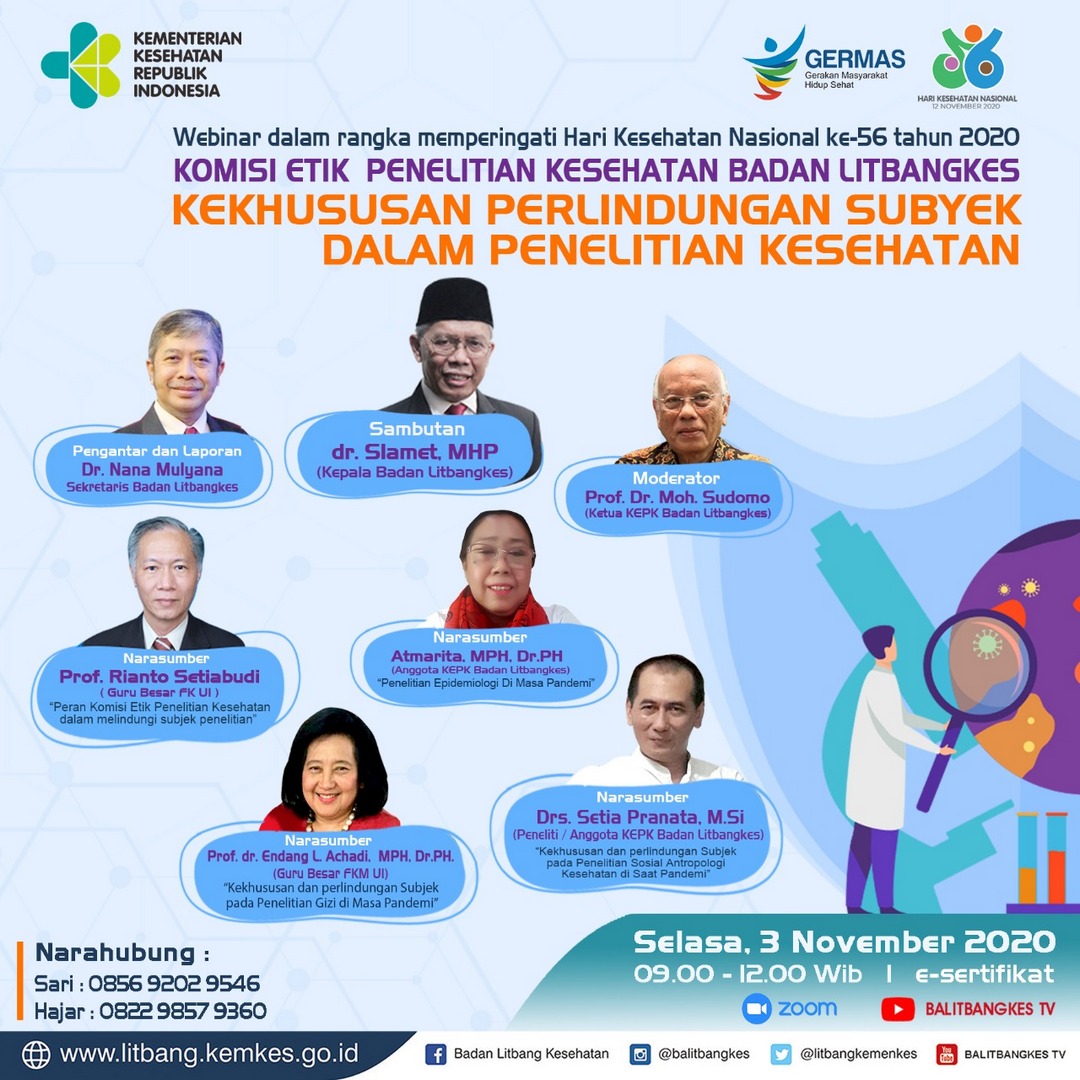 Webinar Dalam Rangka Memperingati Hari Kesehatan Nasional Ke-56 Tahun 2020: Kekhususan Perlindungan Subjek Dalam Penelitian Kesehatan. Selasa, 3 November 2020.